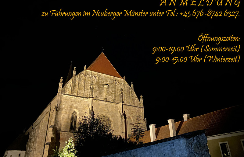 Führungen im Münster mit Kreuzgang bzw. auf den berühmten gotischen Dachstuhl sind ausnahmslos montags bis freitags 9:00-11.00 Uhr und 14:00-16:00 Uhr unter der Tel. Nr. 0676-87426327 anzumelden. Sonntagsführungen sind aus Organisationsgründen bis spätestens freitags 11:00 Uhr unter obiger Tel. Nr. anzumelden.